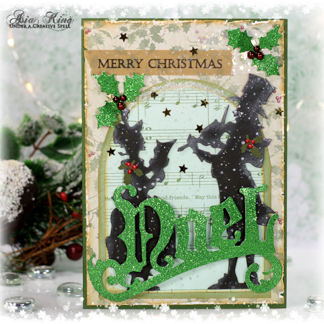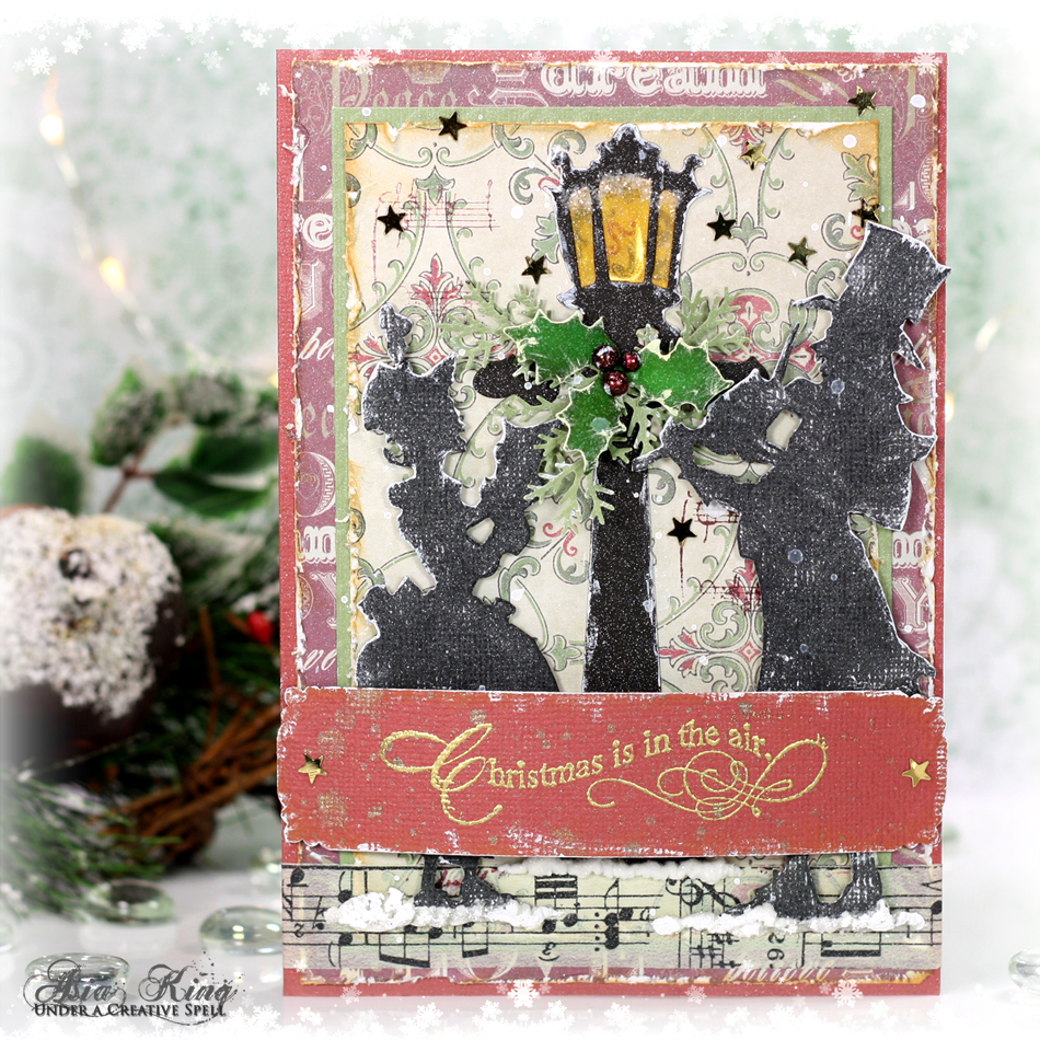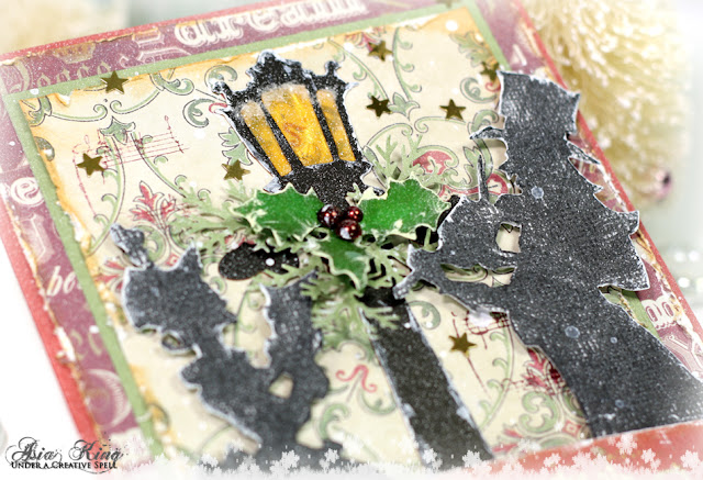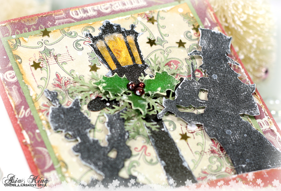 For my background I used a Sleigh & Reindeer (Dreamweaver) and a star background stencil and various embossing pastes from Dreamweaver. I also added some lovely shimmer with Heirloom Gold Perfect Pearls mist.